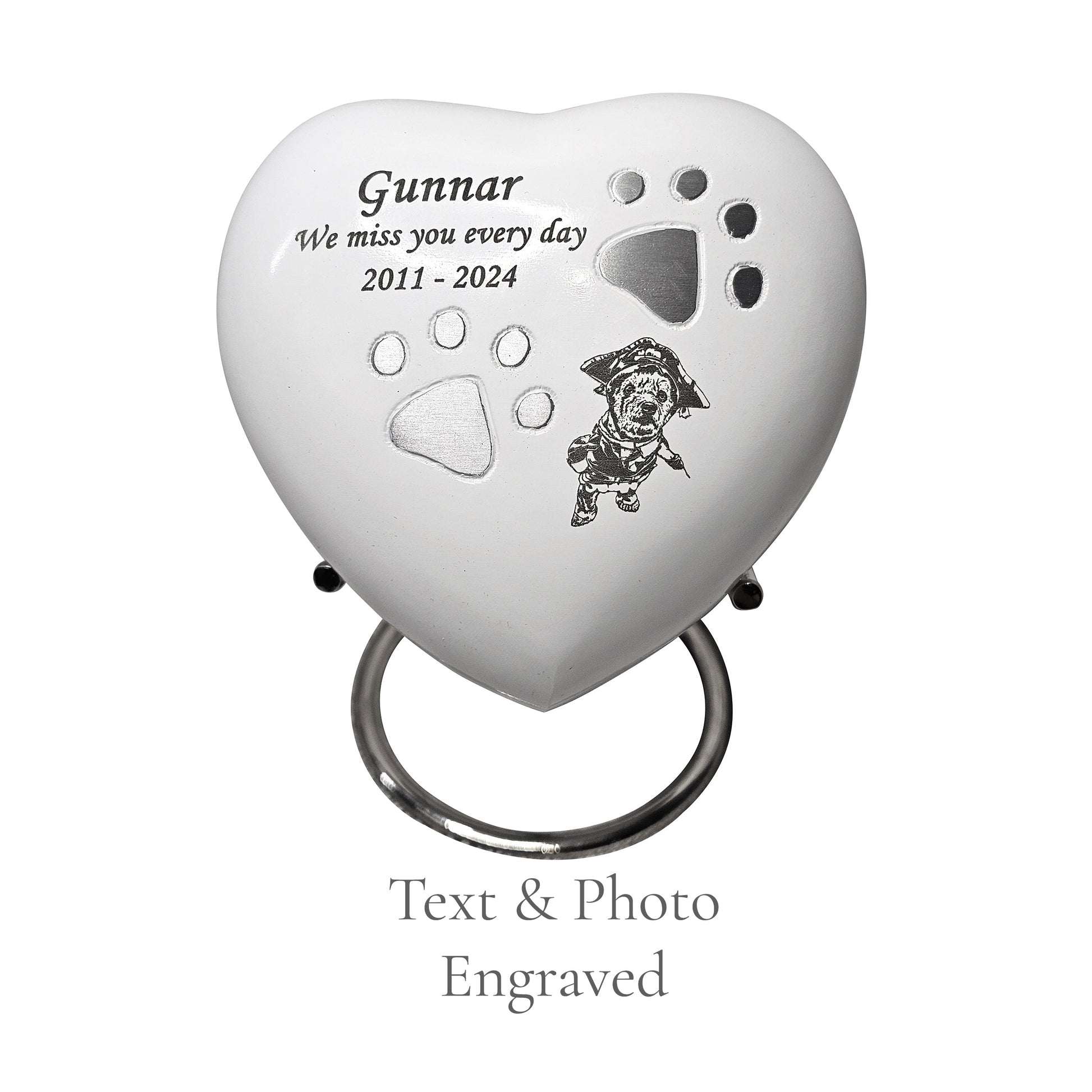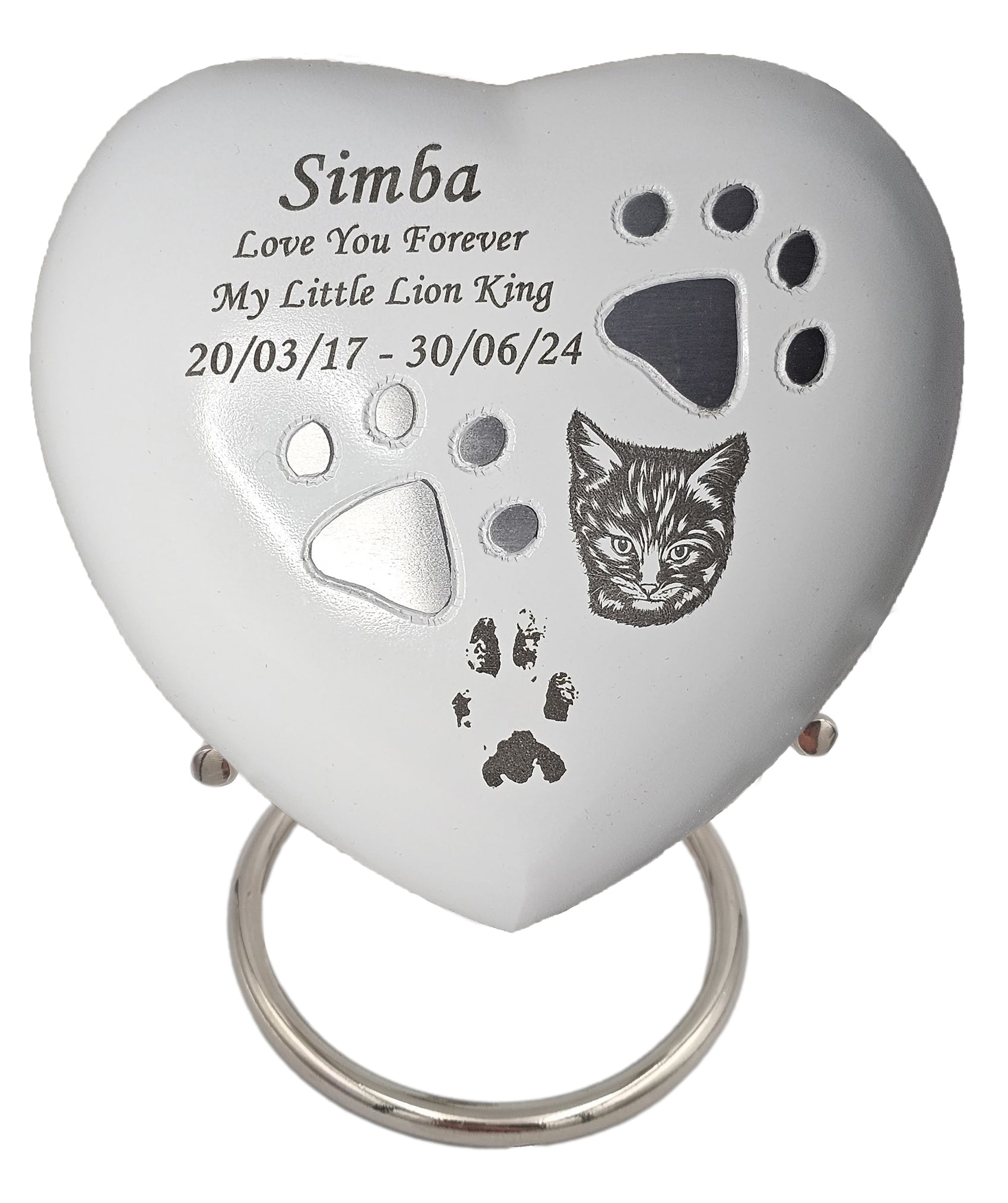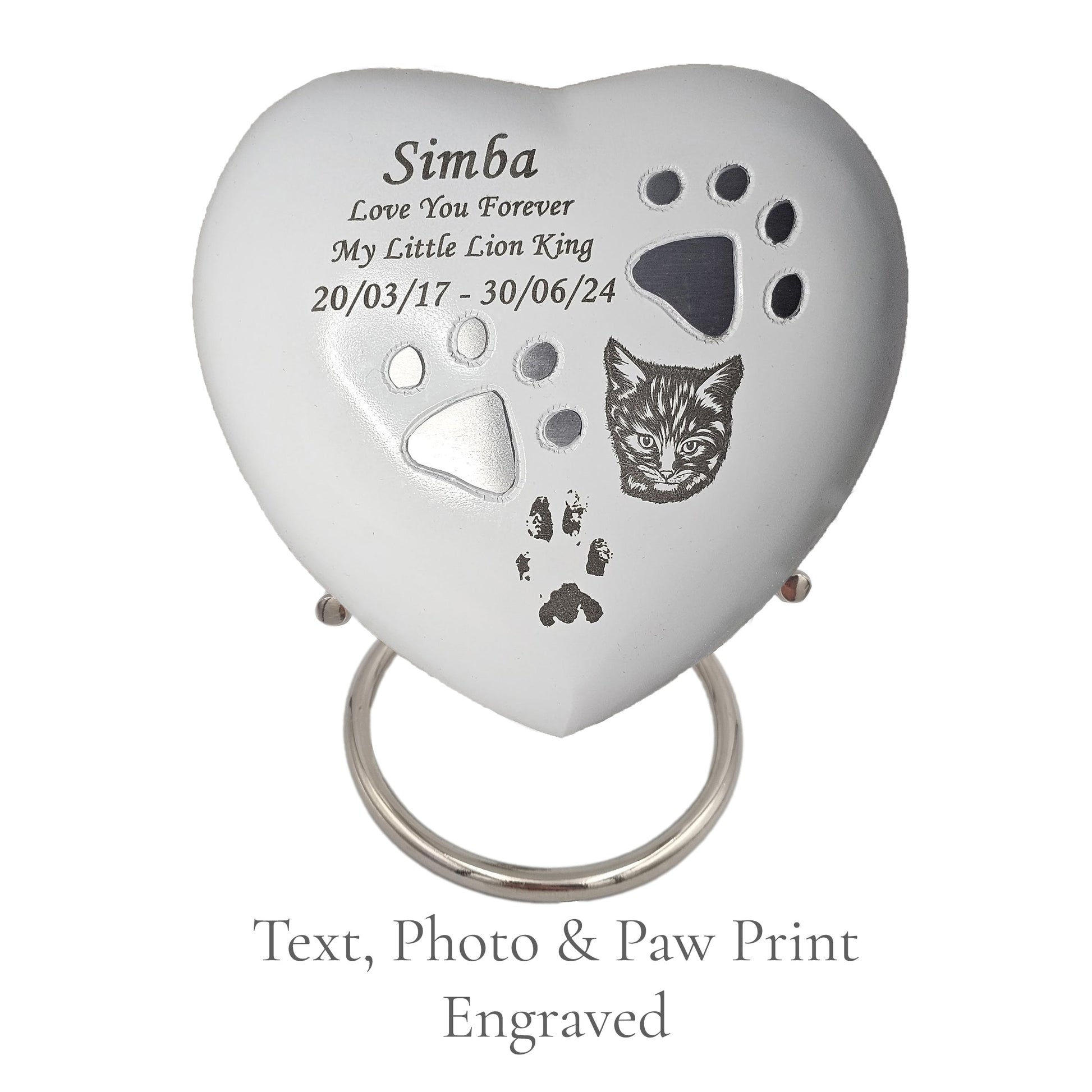 Our white heart pet cremation urn, delicately adorned with silver paw prints, is a timeless tribute to the life and love you shared with your beloved companion. Individually handcrafted with care, its gentle heart-shaped form symbolises love, remembrance, and the unbreakable bond you will always carry.