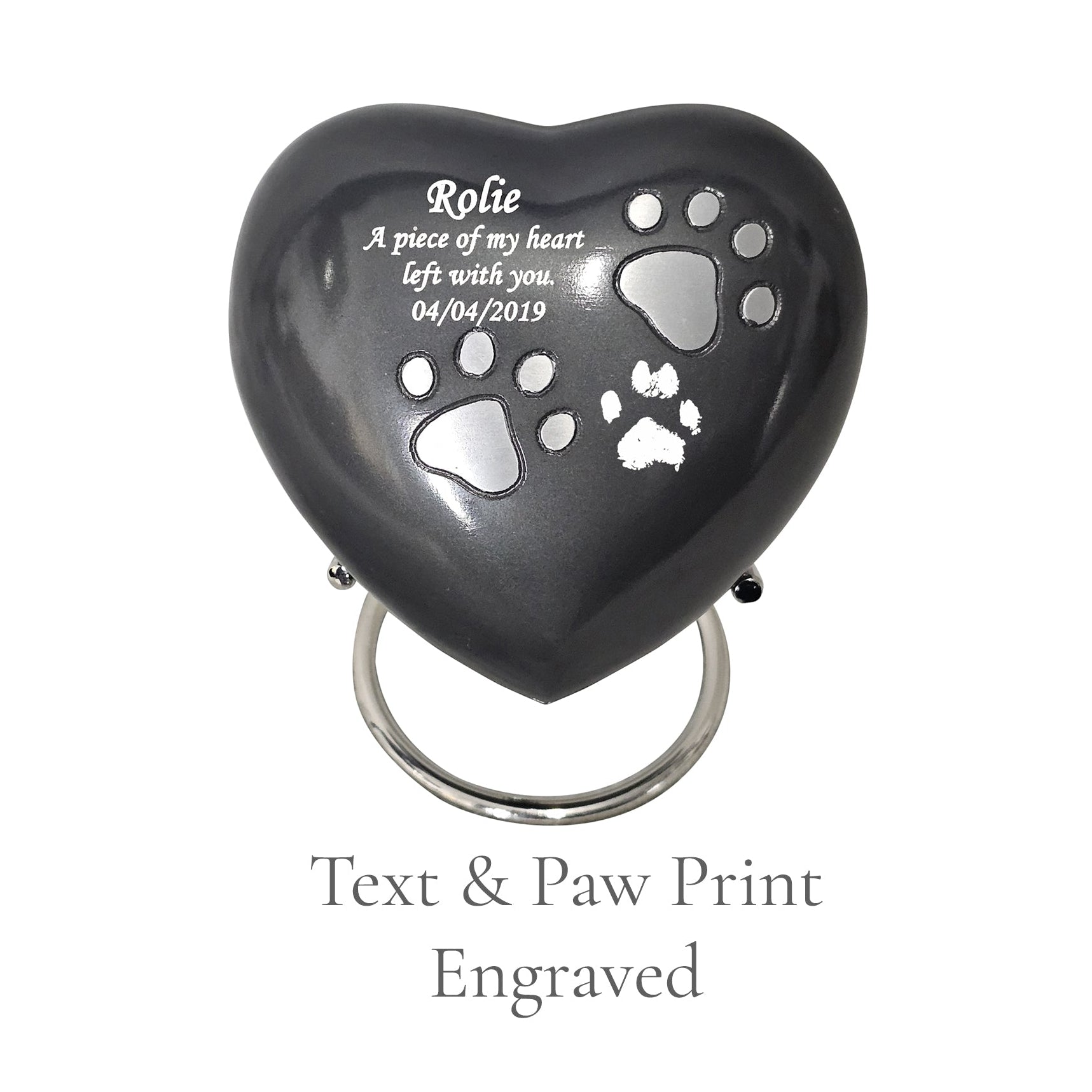 Our grey heart pet cremation urn, delicately adorned with silver paw prints, is a timeless tribute to the life and love you shared with your beloved companion. Individually handcrafted with care, its gentle heart-shaped form symbolises love, remembrance, and the unbreakable bond you will always carry.