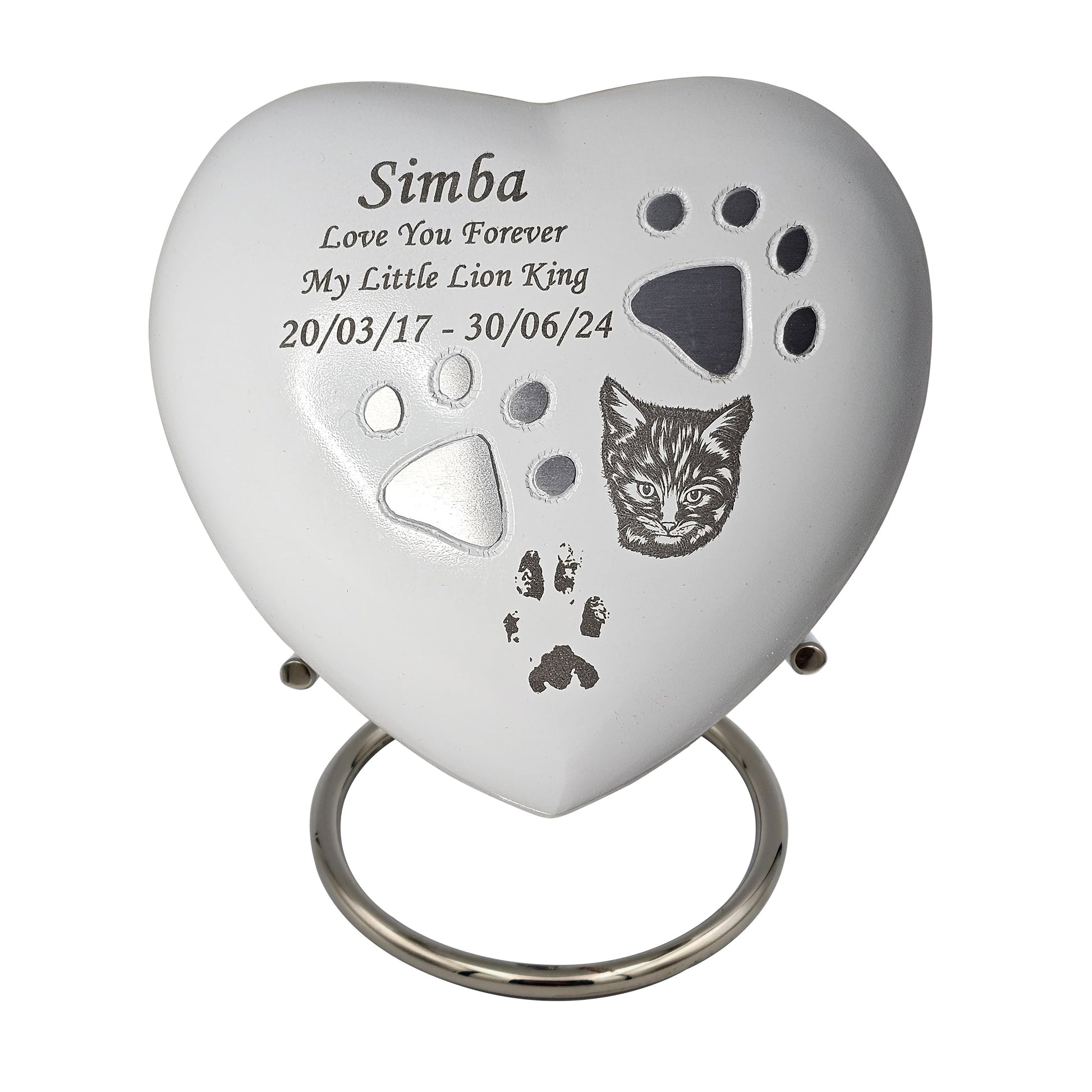 Our white heart pet cremation urn, delicately adorned with silver paw prints, is a timeless tribute to the life and love you shared with your beloved companion. Individually handcrafted with care, its gentle heart-shaped form symbolises love, remembrance, and the unbreakable bond you will always carry.